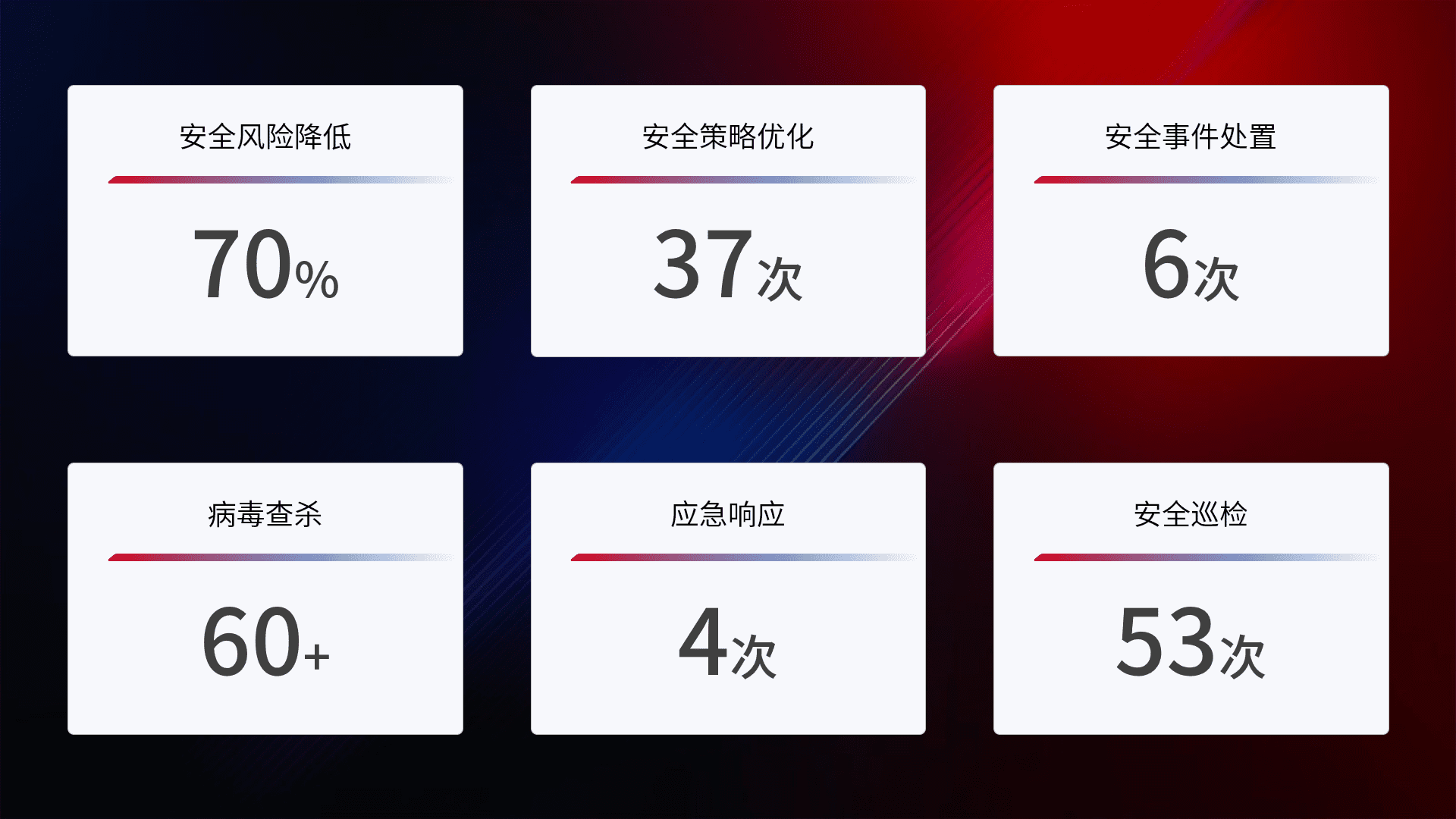 提供全面的安全事件报告体系,,,,包括处置报告、、、周报、、、、季度和年度总结,,结合持续监控,,,,帮助客户深入了解网络安全状况。。。。